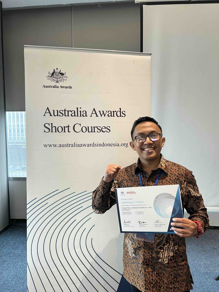 Lecturer of Department of International Relations, Faculty of Social and Political Sciences, Hasanuddin University, H. Abdul Razaq Z. Cangara, S.IP., M.Si., M.IR. has accomplished Australia Awards Short Course on Foreign Policy: Strategic Equilibrium in the Indo-Pacific on 5 February 2026 after undergoing three phases of short course programs, covering Pre-Course Workshop in Jakarta, 26-28 August 2025, in Australia Short Course in Canberra, Brisbane, and Sydney, 10-26 October 2025, and Post-Course Workshop in Jakarta, 3-5 February 2026. This foreign policy short course was organised by Australia Awards Indonesia (AAI), sponsored by the Australian Department of Foreign Affairs and Trade (DFAT), and hosted by Griffith University, Australia.
